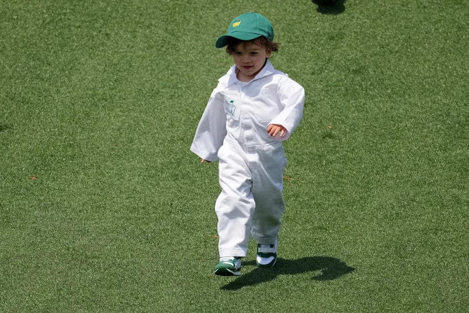 Max Homa’s son Cam walks on the fourth hole during the Par 3 Contest at the Masters Tournament at Augusta National Golf Club.
