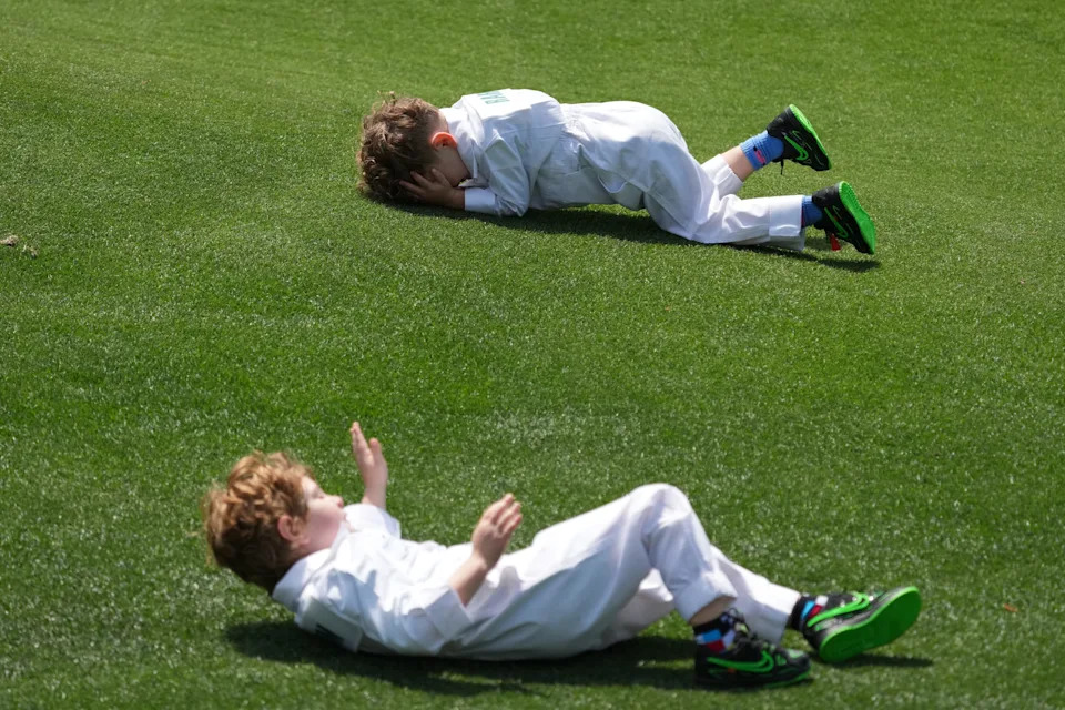 Kepa and Eneko Rahm, sons of Jon Rahm, roll on the grass on the fourth during the Par 3 Contest at the Masters Tournament at Augusta National Golf Club.