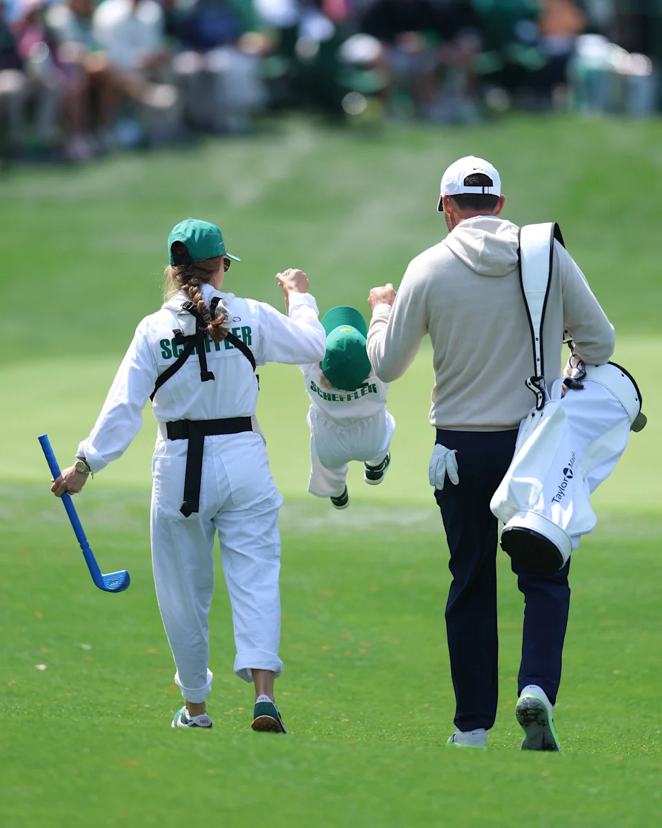 Meredith Scheffler (L) and Scottie Scheffler (R) of the United States swing son Bennett (C) in the air as they walk the sixth hole during the Par Three Contest prior to the 2026 Masters Tournament at Augusta National Golf Club on April 08, 2026 in Augusta, Georgia.