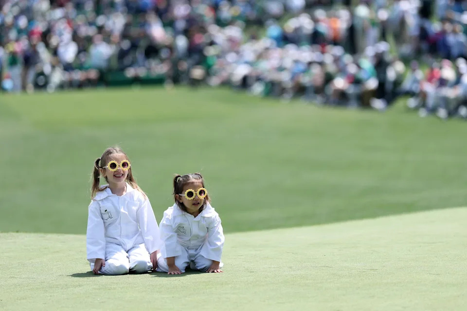 Emerson Lili Spaun and Violet Windsor Spaun, daughters of J.J. Spaun (not pictured) of the United States, watch from the second green during the Par Three Contest prior to the 2026 Masters Tournament at Augusta National Golf Club on April 08, 2026 in Augusta, Georgia.