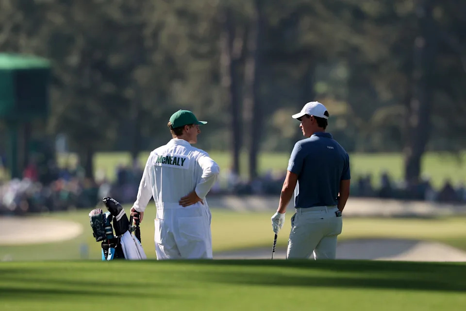 Maverick McNealy, JJ Spaun, and Tyrrell Hatton walk to the second green during the second round of the Masters Tournament at Augusta National Golf Club.