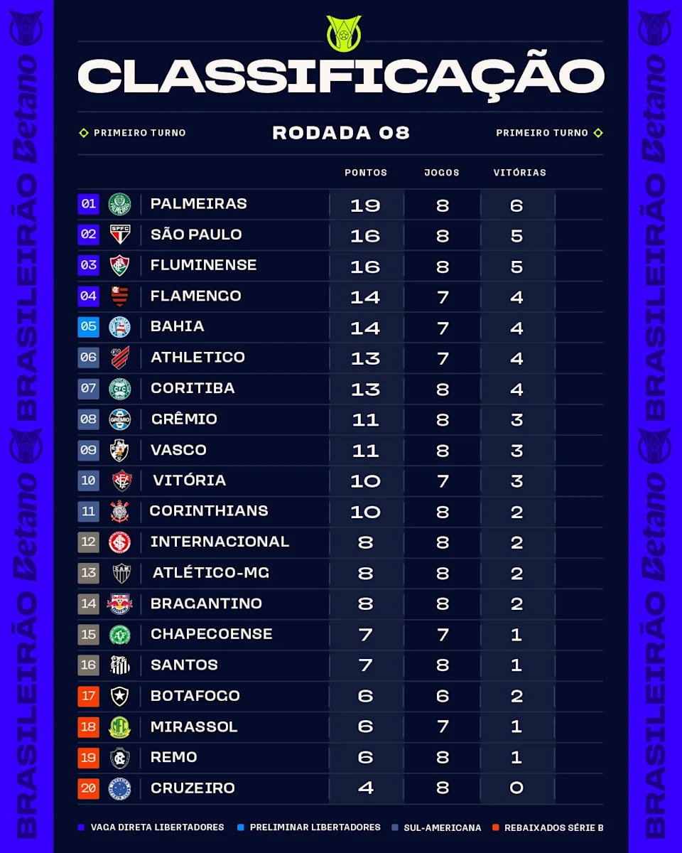 Bahia, Flamengo, Athletico, Vitória, Chapecoense, and Mirassol each have one game less. Botafogo has only played six matches.