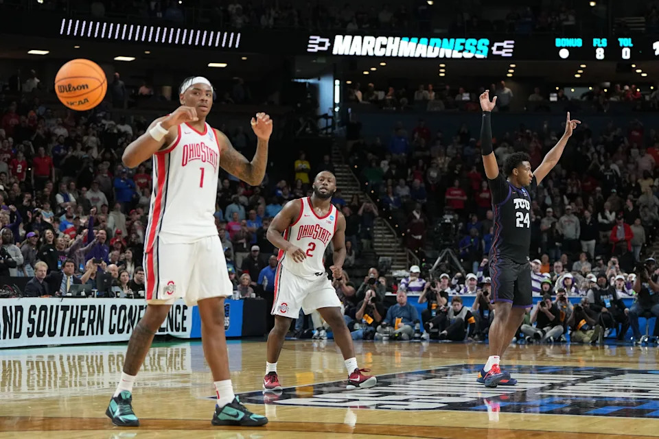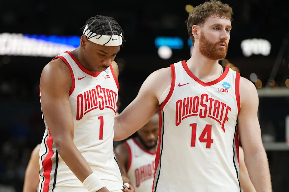 Ohio State Buckeyes forward Amare Bynum (1) and Ohio State Buckeyes forward Brandon Noel (14) react after losing to Texas Christian University Horned Frogs during a first round game of the men’s 2026 NCAA Tournament at Bon Secours Wellness Arena on March 19, 2026 in Greenville, SC.