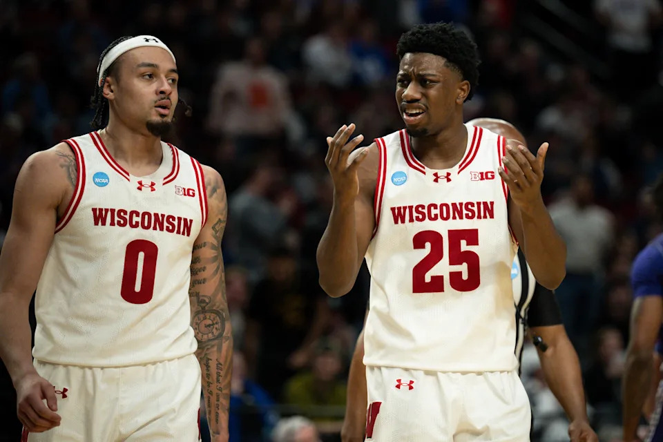 Wisconsin Badgers guard Braeden Carrington (0) and guard John Blackwell (25) react during the second half of a first round game of the men’s 2026 NCAA Tournament against the High Point Panthers at Moda Center on March 19, 2026 in Portland, Or.
