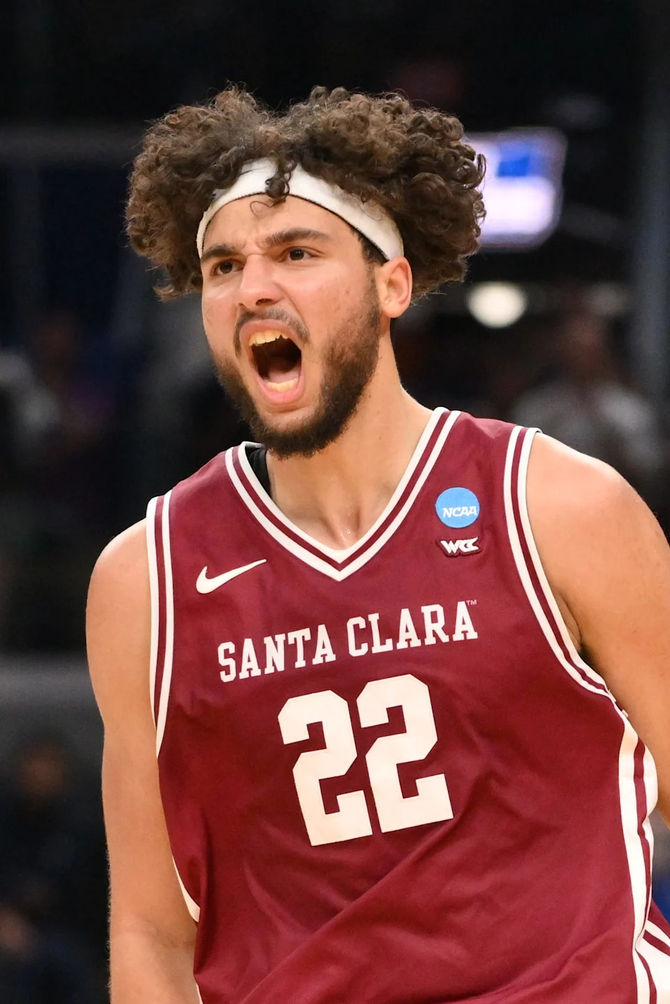 Santa Clara Broncos forward Allen Graves (22) reacts after making a basket against the Kentucky Wildcats during the second half of a first round game of the men’s 2026 NCAA Tournament at Enterprise Center.