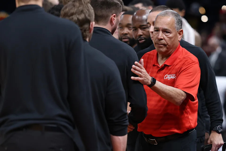 Head coach Kelvin Sampson of the Houston Cougars shakes hands with members of the Idaho Vandals following the first round game of the 2026 NCAA Men’s Basketball Tournament at Paycom Center on March 19, 2026, in Oklahoma City, Oklahoma.