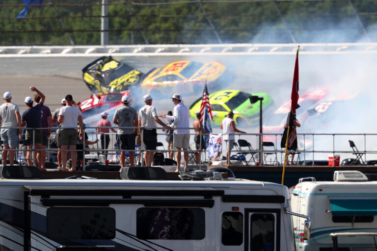 The NASCAR Cup Series race at Talladega took a wild turn when an incident took out the majority of the cars in the field after 115 laps. Footage of the incident highlights a series of chain reactions, dropping visibility to near zero in those moments as a cloud of dust took over a section of Talladega Superspeedway.