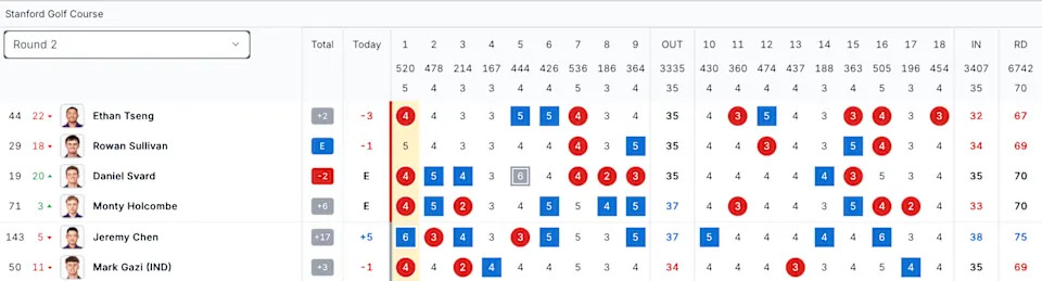 Stanford Golf Course proved challenging throughout the event. The par-70 layout played to a 72.27 average over three rounds, with each day yielding similar scoring conditions. The course’s three par-5s were the easiest holes on the property and three of the four holes that played under par for the tournament. The par-5 16th was the easiest at 4.69. Meanwhile, eight holes played at least two-tenths of a stroke over par, with the par-4 sixth standing as the toughest at 4.37.