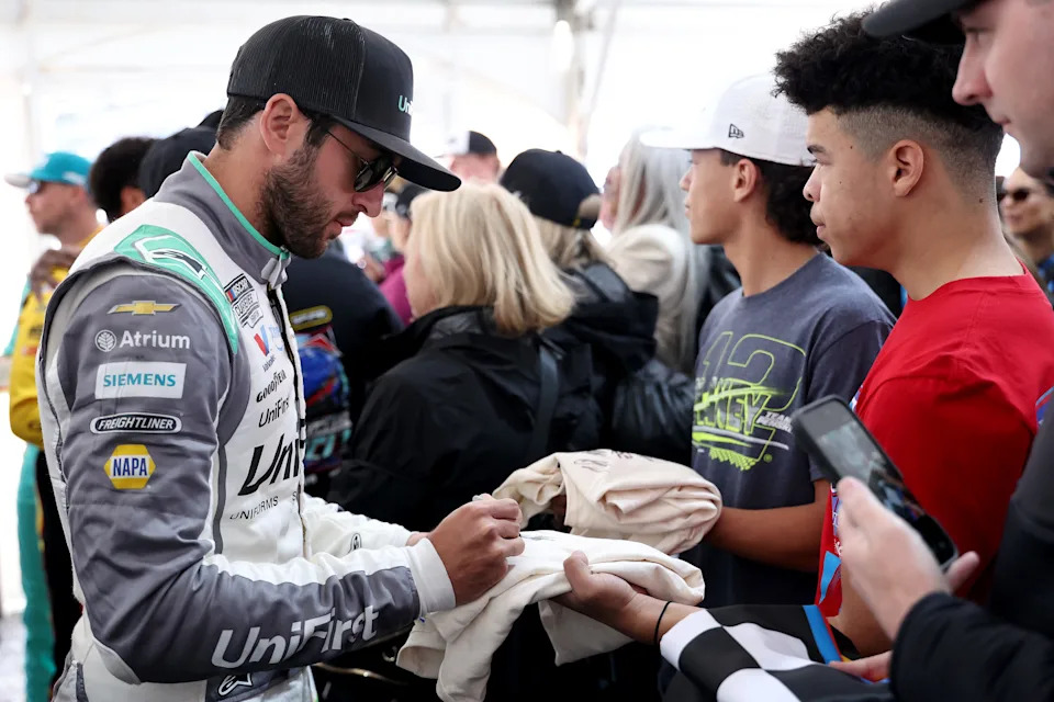 MARTINSVILLE, VIRGINIA – MARCH 29: Chase Elliott, driver of the #9 UniFirst Chevrolet, signs autographs for NASCAR fans during the drivers meeting prior to the NASCAR Cup Series Cook Out 400 at Martinsville Speedway on March 29, 2026 in Martinsville, Virginia. (Photo by David Jensen/Getty Images)