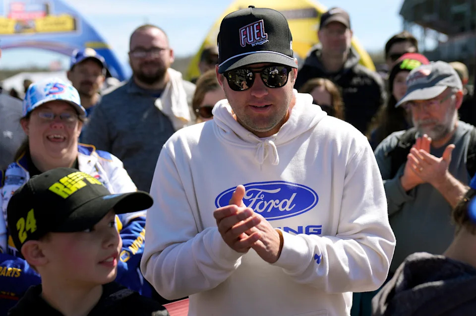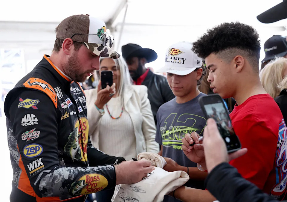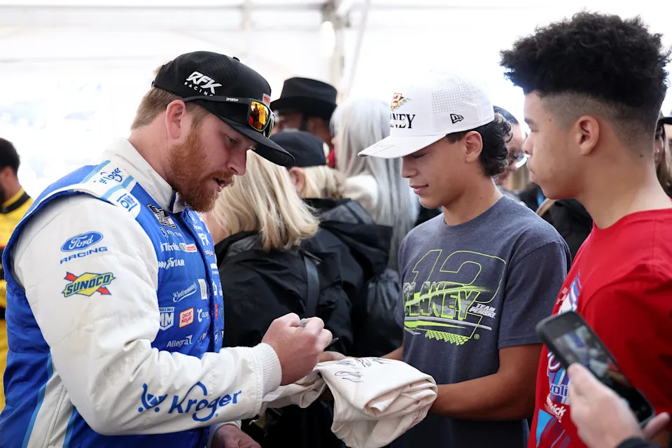 MARTINSVILLE, VIRGINIA – MARCH 29: Chris Buescher, driver of the #17 Kroger/Thomas’ High Protein Ford, signs autographs for NASCAR fans during the drivers meeting prior to the NASCAR Cup Series Cook Out 400 at Martinsville Speedway on March 29, 2026 in Martinsville, Virginia. (Photo by David Jensen/Getty Images)