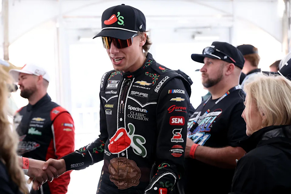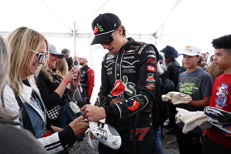 MARTINSVILLE, VIRGINIA – MARCH 29: Carson Hocevar, driver of the #77 Chili’s Ride The ‘Dente Chevrolet, signs autographs for NASCAR fans during the drivers meeting prior to the NASCAR Cup Series Cook Out 400 at Martinsville Speedway on March 29, 2026 in Martinsville, Virginia. (Photo by David Jensen/Getty Images)