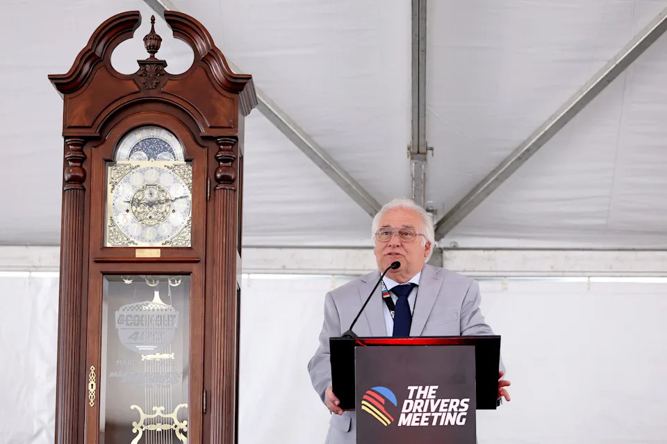 MARTINSVILLE, VIRGINIA – MARCH 29: Clay Campbell, Martinsville Speedway President speaks during the drivers meeting prior to the NASCAR Cup Series Cook Out 400 at Martinsville Speedway on March 29, 2026 in Martinsville, Virginia. (Photo by David Jensen/Getty Images)