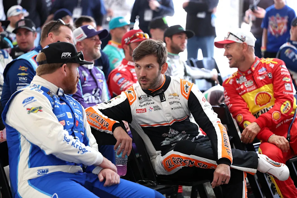 MARTINSVILLE, VIRGINIA – MARCH 29: Daniel Suarez, driver of the #7 Group 1001 Chevrolet, (C) speaks to Chris Buescher, driver of the #17 Kroger/Thomas’ High Protein Ford, (L) during the drivers meeting prior to the NASCAR Cup Series Cook Out 400 at Martinsville Speedway on March 29, 2026 in Martinsville, Virginia. (Photo by David Jensen/Getty Images)