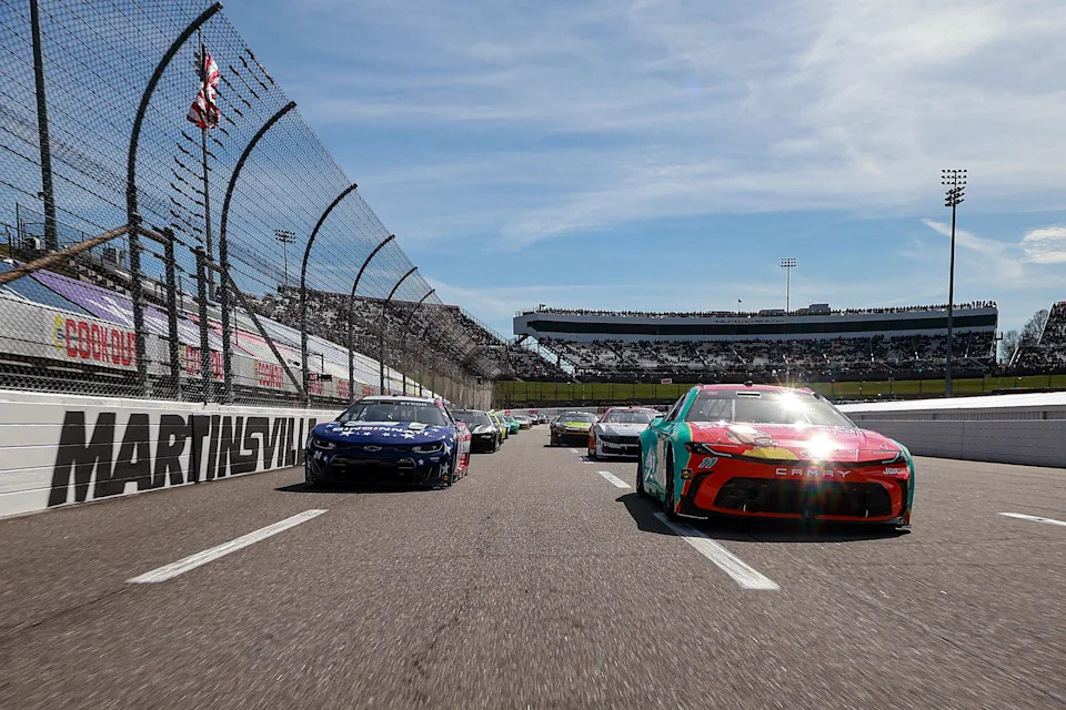 MARTINSVILLE, VIRGINIA – MARCH 29: Denny Hamlin, driver of the #11 Bob’s Discount Furniture Toyota, leads the field to the green flag to start the NASCAR Cup Series Cook Out 400 at Martinsville Speedway on March 29, 2026 in Martinsville, Virginia. (Photo by Jacob Kupferman/Getty Images)