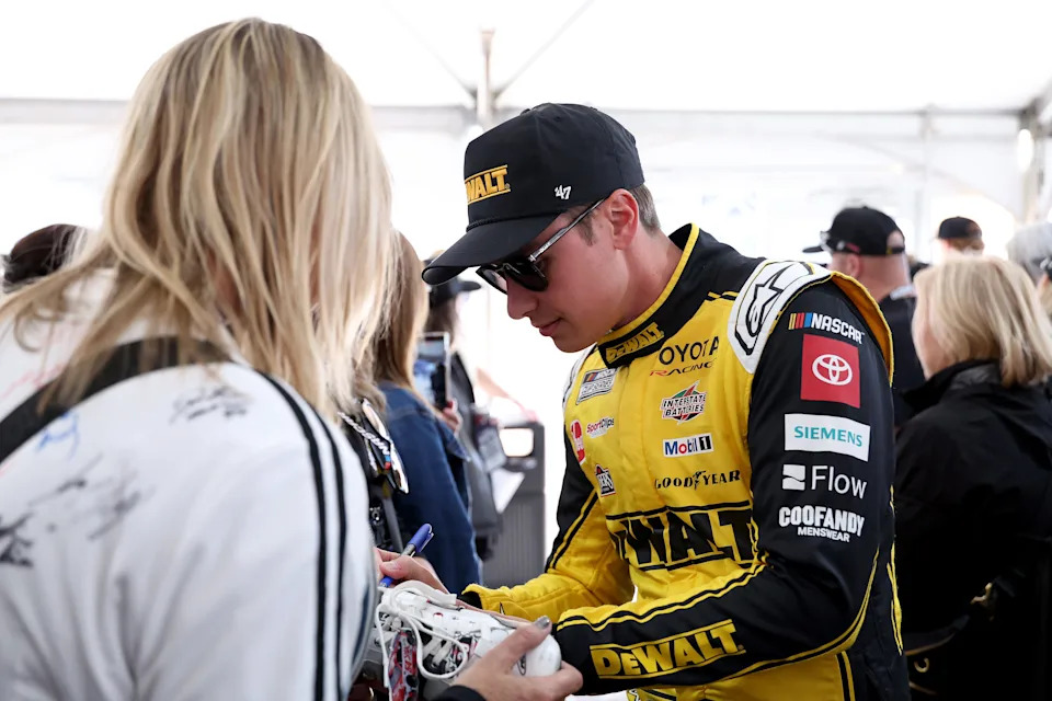 MARTINSVILLE, VIRGINIA – MARCH 29: Christopher Bell, driver of the #20 DEWALT Toyota, signs autographs for NASCAR fans during the drivers meeting prior to the NASCAR Cup Series Cook Out 400 at Martinsville Speedway on March 29, 2026 in Martinsville, Virginia. (Photo by David Jensen/Getty Images)