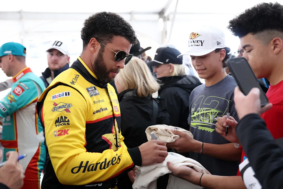 MARTINSVILLE, VIRGINIA – MARCH 29: Bubba Wallace, driver of the #23 Hardee’s Toyota, signs autographs for NASCAR fans during the drivers meeting prior to the NASCAR Cup Series Cook Out 400 at Martinsville Speedway on March 29, 2026 in Martinsville, Virginia. (Photo by David Jensen/Getty Images)