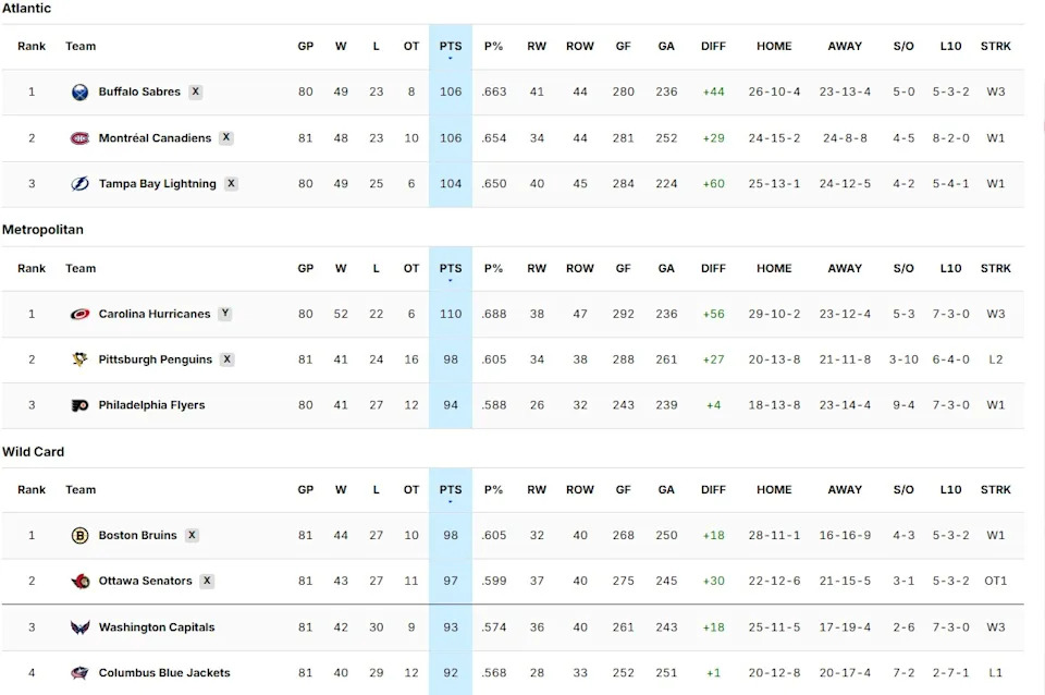 In the end, the drama didn’t go down to Game 82 for the Wild Cards – Ottawa won four-straight games last week and has a 5-1-1 April record to salvage their season and advance to the playoffs. Boston wasn’t hot in April (0-3-2 prior to yesterday’s win against Columbus) but managed to do enough in the second half of March (8-4-4 from March 14th on) to glide into a spot above the rest of the Metropolitan Division, courtesy of teams like the Blue Jackets and Islanders running out of steam in a major way over the last 10-12 games.