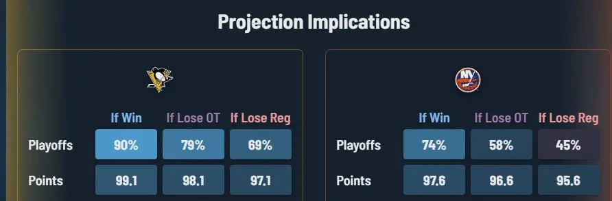 The good news for the Penguins is while this game is huge with massive implications, it’s hardly a ‘must win’ game. Winning, obviously, is more helpful to the situation than a loss, but the team has more chances down the stretch. The Hockeystat’s model projects Pittsburgh to end up with 98 points at the end of the season. That becomes more difficult and less margin of error to get there with a loss tomorrow, though it’s still possible the team could win five out of their last eight games and end up in the same place.