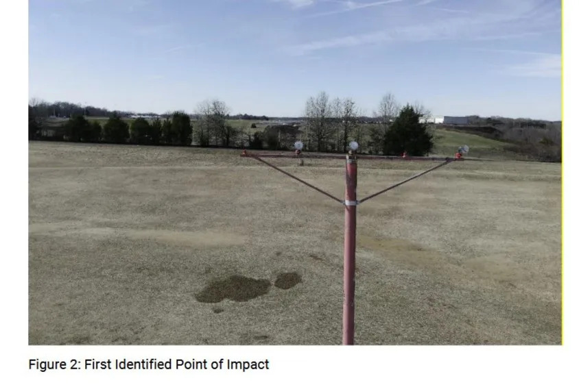 “Examination of the accident site revealed that the first identified point of impact (FIPI) was the first (easternmost) light station of the runway 28 Medium Intensity Approach Light System with Runway Alignment Indicator Lights (MALSR), located about 1,380 ft from the runway threshold. Two lightbulbs, the left and fourth from the left position (when viewed looking towards the runway), approximately 6 ft apart, were separated from the otherwise intact 29 ft tall light station (below) and located on the ground near the station. The upper portion of the second MALSR light station located about 180 ft from the FIPI was separated, of which about 15 ft of the frangible pole was still standing. A group of damaged trees located about 235 ft from the FIPI, were sheared about 12 ft above ground level (agl). The first indication of fire was blackened branches and grass near the west side of the trees.