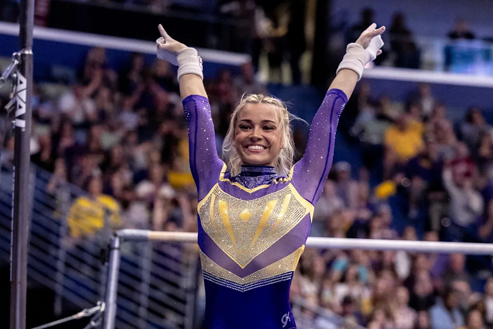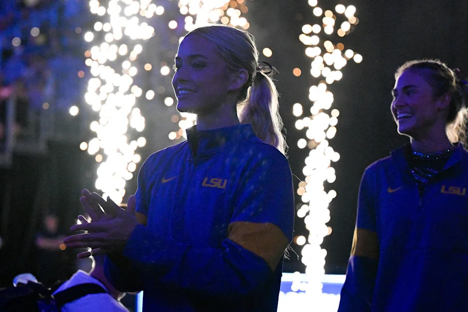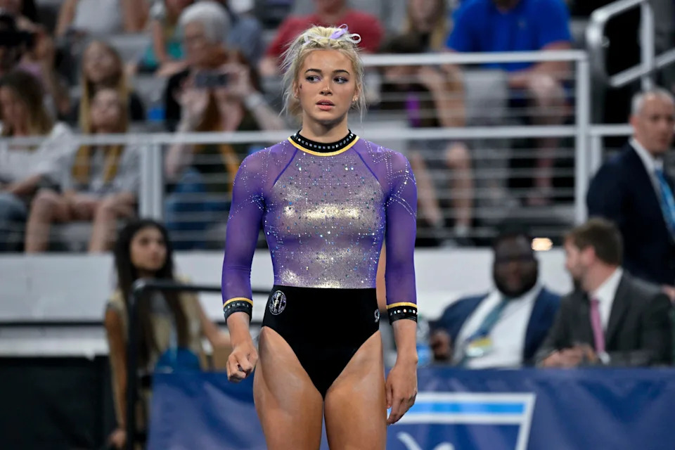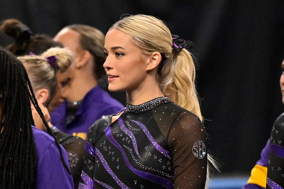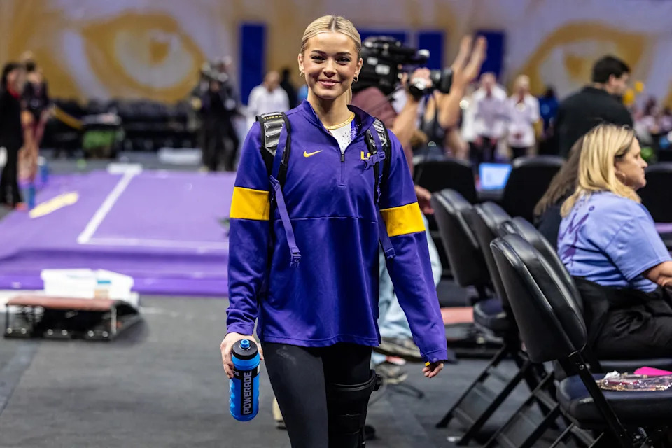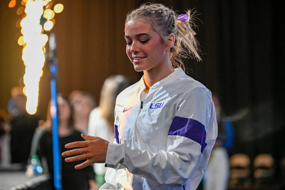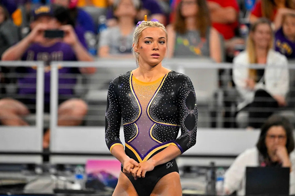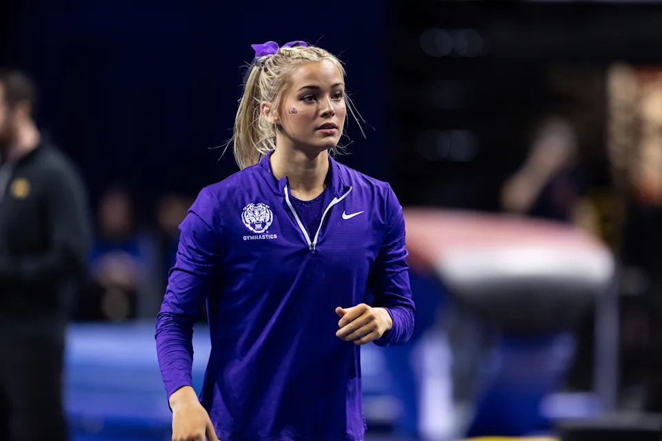 Olivia Dunne looks on against the Florida Gators before a meet in 2024.