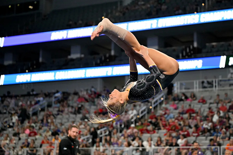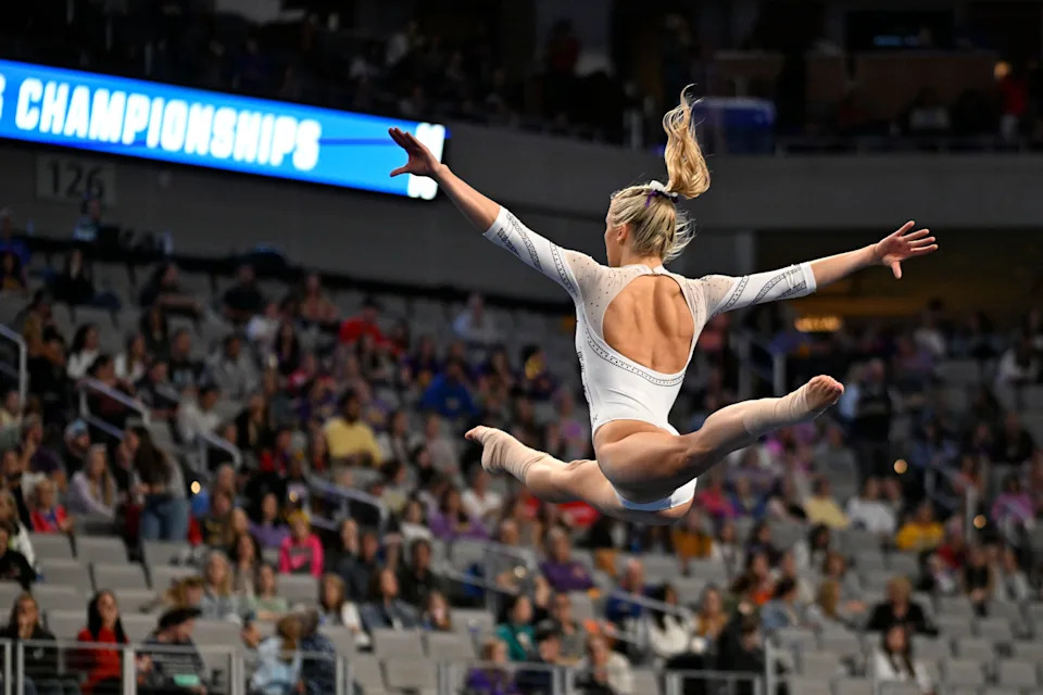 Olivia Dunne practices on floor routine with her team during the 2023 NCAA Women’s National Gymnastics Tournament Championship.