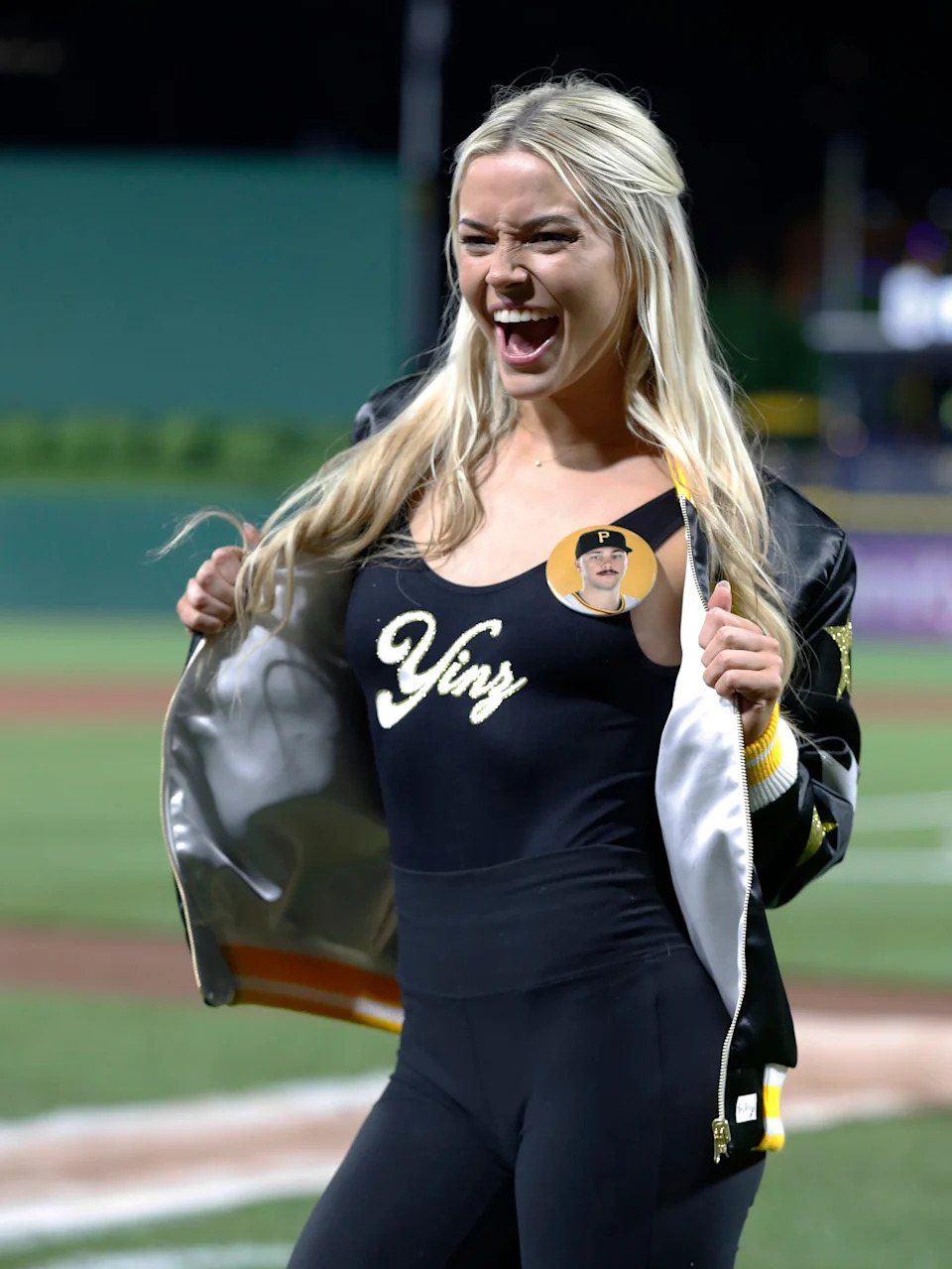 Olivia Dunne on the field in Pittsburgh after her boyfriend Paul Skenes made his MLB debut in May 2024.