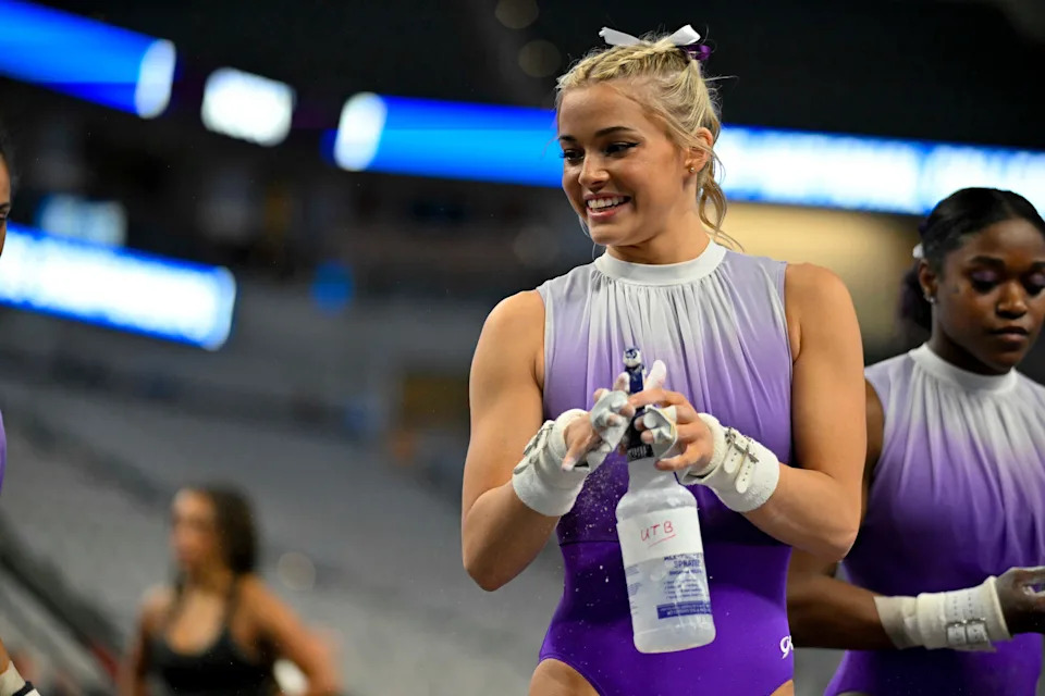 Olivia Dunne warms up on floor during the 2024 NCAA Women’s National Gymnastics Semifinals at Dickies Arena.