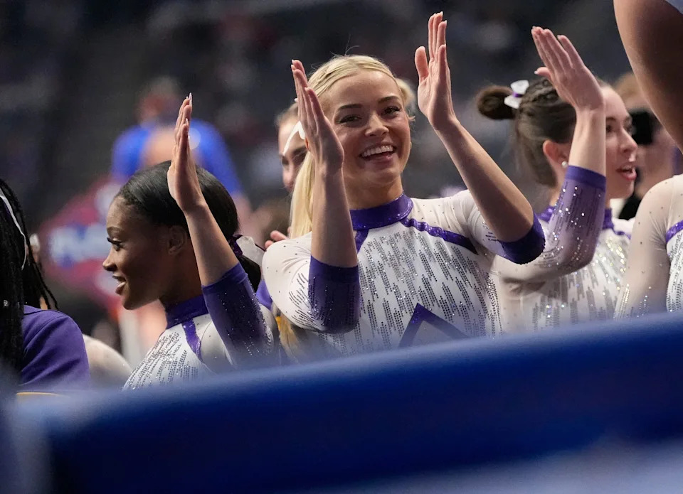 Livvy Dunne cheers for the LSU gymnastic team during during the 2025 NCAA gymnastics semifinals.
