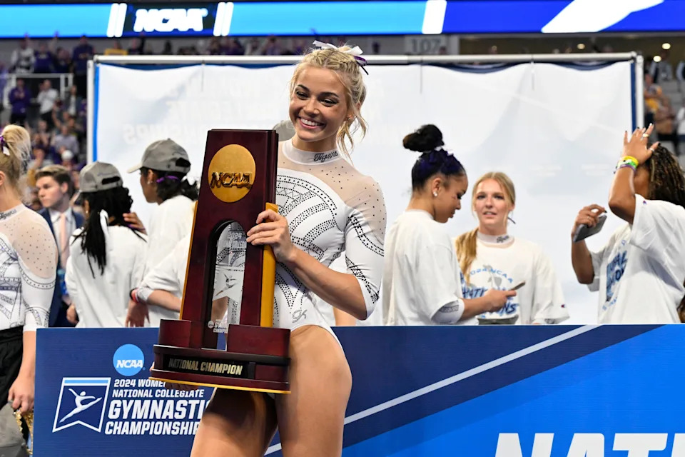 Olivia Dunne poses with the trophy after the LSU Tigers gymnastics team wins the national championship in the 2024 Women’s National Gymnastics Championship.