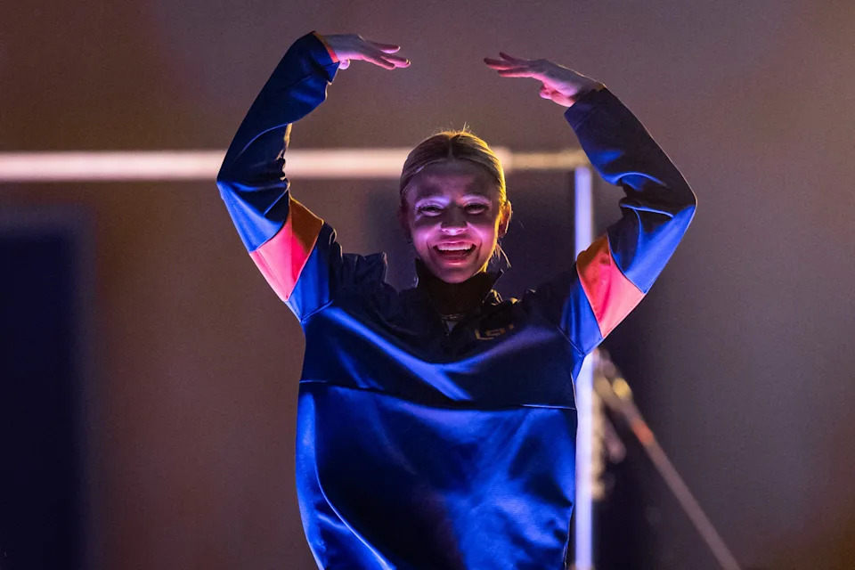 Livvy Dunne gestures to fans during Session 2 of the SEC Gymnastics Championship at Legacy Arena in Birmingham, Alabama in 2025.