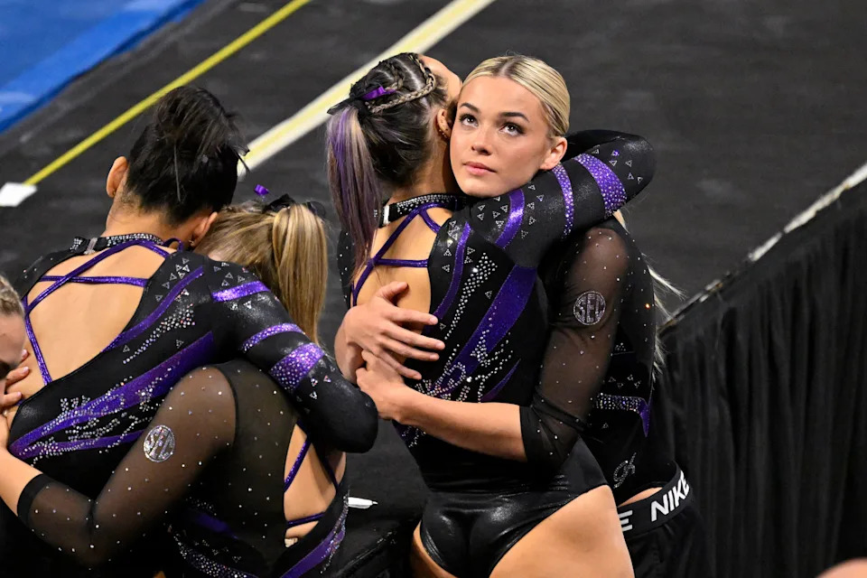 Livvy Dunne hugs an LSU teammate during the 2025 NCAA gymnastics semifinals.