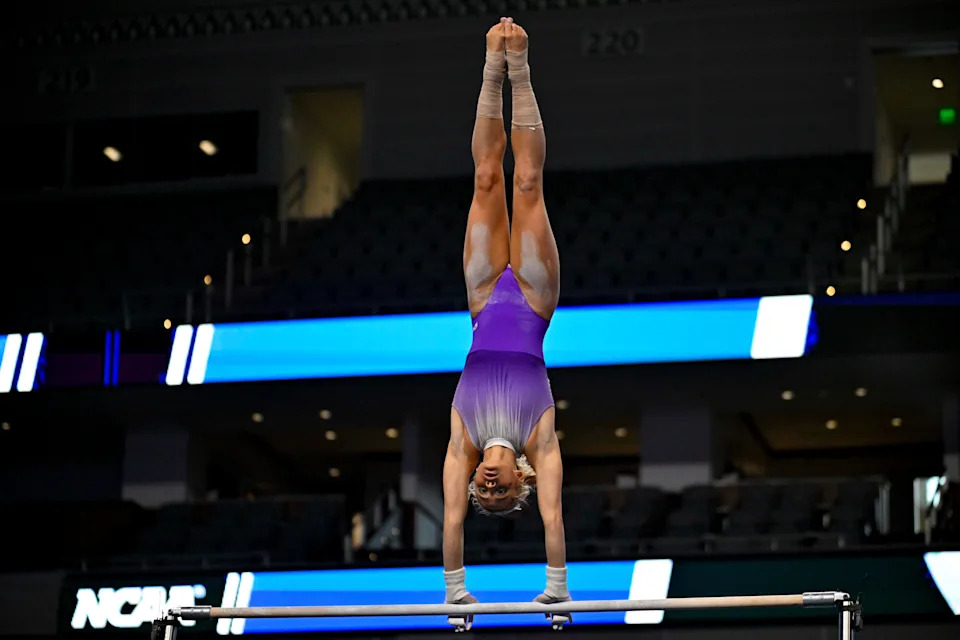 Olivia Dunne warms up on uneven bars before the start of the 2024 Women’s National Gymnastics Championship at Dickies Arena.