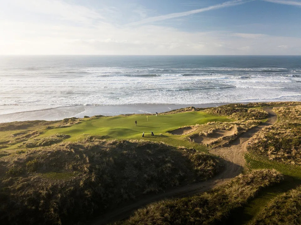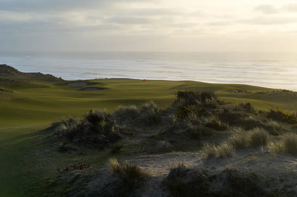 The short, par-4 16th at Bandon Dunes plays tight to the cliffs above the ocean at Bandon Dunes Golf Resort in Oregon.