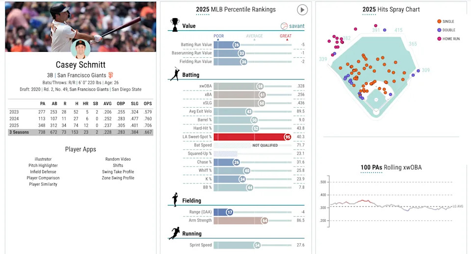 Overall, Schmitt made some impressive strides with his plate discipline, but he still ranked below average in BB, K, Whiff, and Chase percentiles. His slightly above average ability to hit the ball hard (when he hits the ball) buoyed him to becoming a pretty average offensive player (101 OPS+) in 2025. Though a MiLB Gold Glove winner years ago, he didn’t rate too well defensively either. All of that so-so-ness meant Buster Posey was keen on finding a replacement. The fact that the replacement was Luis Arraez caused some consternation, but there’s no doubt that the three-time batting champ adds a much-needed, and immediate, contact dynamic to the Giants’ line-up that Schmitt does not.