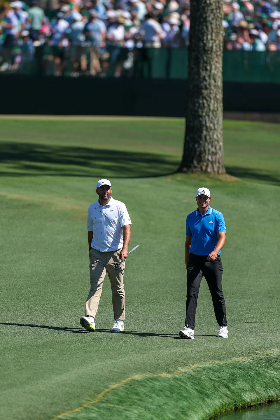 Scottie Scheffler of the United States and Ludvig Aberg of Sweden walk the 16th fairway during the third round of the 2026 Masters Tournament at Augusta National Golf Club on April 11, 2026, in Augusta, Georgia.