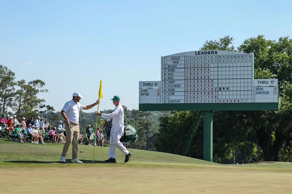 Scottie Scheffler of the United States hands the flag to his caddie Ted Scott on the 18th green during the third round of the 2026 Masters Tournament at Augusta National Golf Club on April 11, 2026, in Augusta, Georgia.