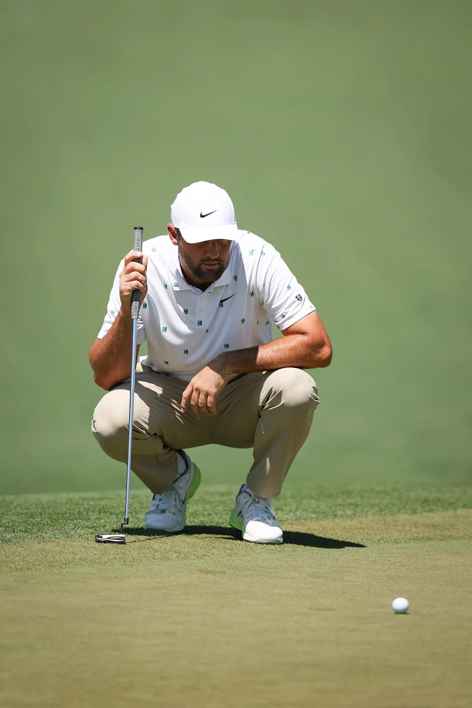 Scottie Scheffler of the United States lines up a putt on the second green during the third round of the 2026 Masters Tournament at Augusta National Golf Club on April 11, 2026, in Augusta, Georgia.