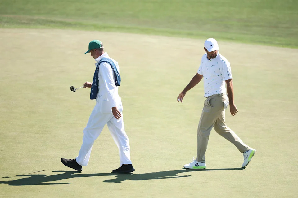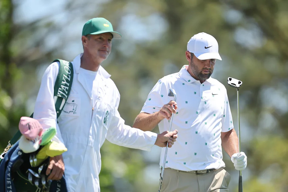 Scottie Scheffler of the United States hands a club to his caddie Ted Scott on the fourth hole during the third round of the 2026 Masters Tournament at Augusta National Golf Club on April 11, 2026, in Augusta, Georgia.