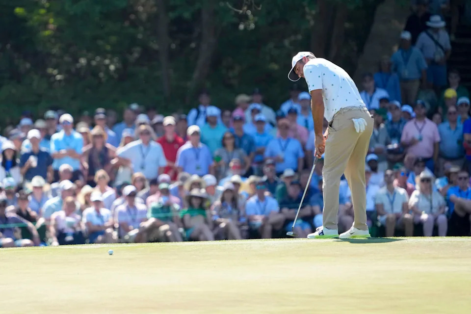 Scottie Scheffler putts on the 15th green during the third round of the Masters Tournament at Augusta National Golf Club.