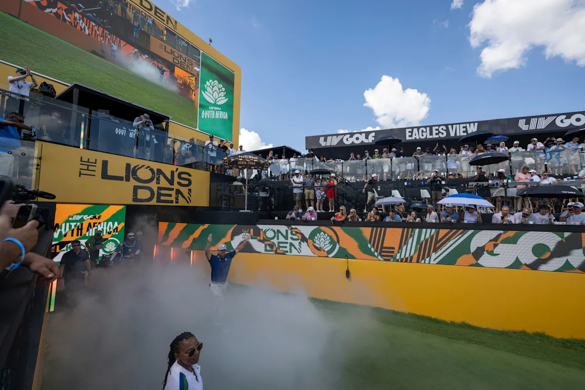 Perhaps Burmester spoke too soon, though, because on Friday, he hit a highlight-reel shot to send the crowd into a frenzy at the par-3 17th, which LIV Golf has dubbed “The Lion’s Den” — a stadium-like party atmosphere similar to that of the 16th at TPC Scottsdale — complete with pyrotechnics and all.