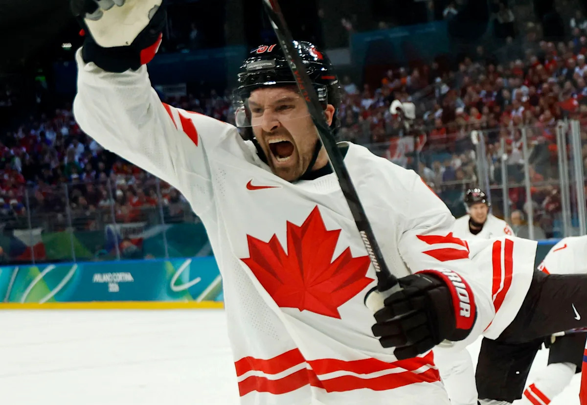 Feb 12, 2026; Milan, Italy; Mark Stone of Canada celebrates scoring their second goal against Czechia in a men’s ice hockey group A match during the Milano Cortina 2026 Olympic Winter Games at Milano Santagiulia Ice Hockey Arena. Mandatory Credit: Geoff Burke-Imagn Images