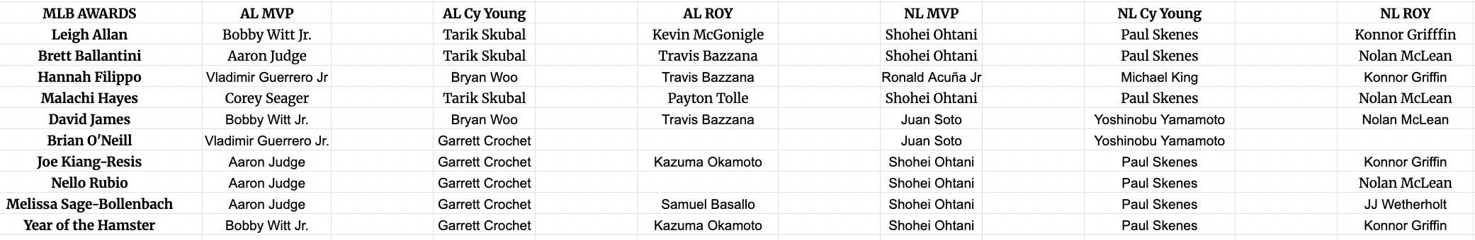 Most of us have learned our MVP lessons and are meekly prognosticating repeats wins for Aaron Judge and Shohei Ohtani. It looks like a two-arm race for AL Cy Young, with the NL looking like a runaway for Paul Skenes.