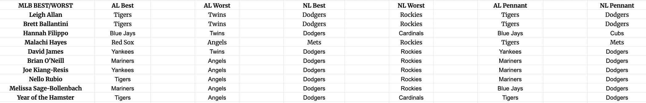 The race for the AL’s best seems quite a fight, at least opposed to the NL. In the case of league worsts, there is fight between two teams in both leagues — and in the AL, no one picked the White Sox! Novel.