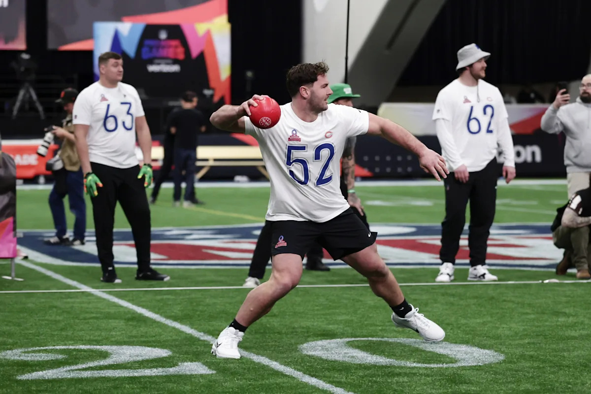 SAN FRANCISCO, CALIFORNIA – FEBRUARY 2: Drew Dalman #52 of the Chicago Bears throws the ball during the 2026 Pro Bowl Skills Challenge at the NFL Pro Bowl Games at Moscone Center South on February 2, 2026 in San Francisco, California. (Photo by Kara Durrette/Getty Images) | Getty Images