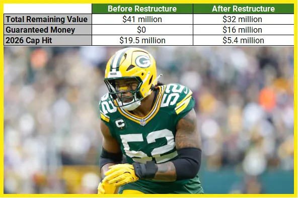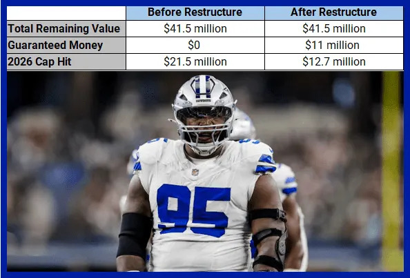 For the Cowboys: The front office accomplished two things with this restructure. First, they dropped his average annual cost from $17 million to $11 million, making him more reasonably priced. Additionally, the move created $9.3 million in immediate cap space for the 2026 season by reducing his base salary to the league minimum and converting the rest into a signing bonus that the team is able to spread out over five years, with the last two being added void years. This allowed them to drop his cap hit for the upcoming season from $18 million to $8.7 million.