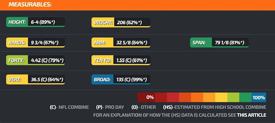 A 6’2” “X” receiver that is projected to go in Round 2, Sarratt and Mendoza mastered the back shoulder throw at the college level in 2025. Here are Sarratt’s measurables that make a physical threat.