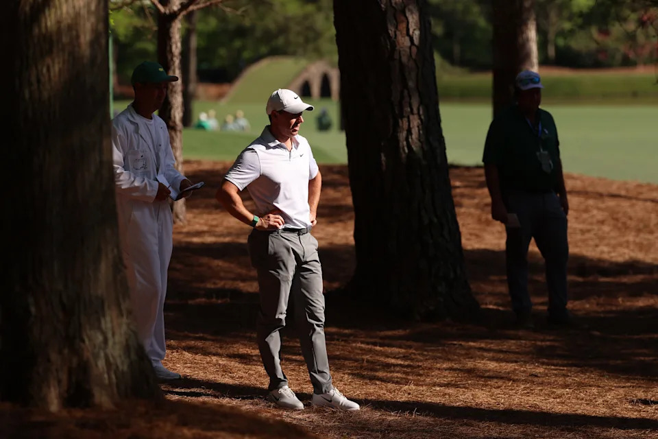 Rory McIlroy prepares his shot from the pine straw on the thirteenth hole during the second round of the Masters Tournament at Augusta National Golf Club.