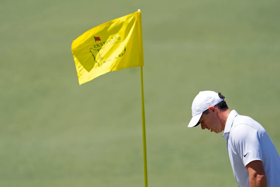 Rory McIlroy reacts after a putt on the seventh hole during the second round of the Masters Tournament at Augusta National Golf Club.