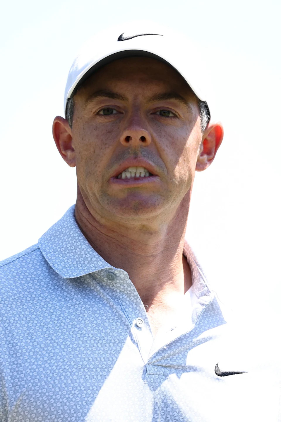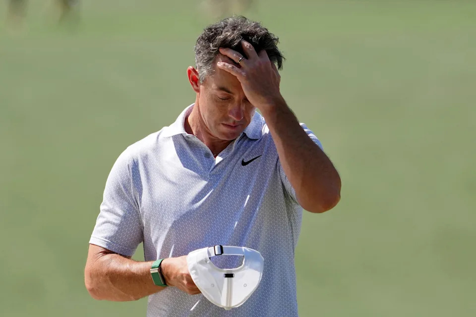 Rory McIlroy reacts at the eighth tee during the second round of the Masters Tournament at Augusta National Golf Club.