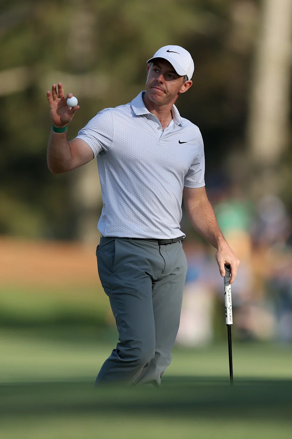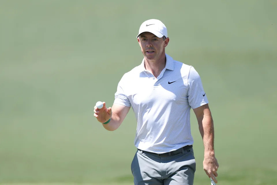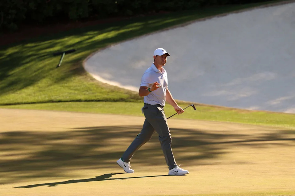 Rory McIlroy of Northern Ireland waves on the eighth green during the second round of the 2026 Masters Tournament at Augusta National Golf Club on April 10, 2026, in Augusta, Georgia.